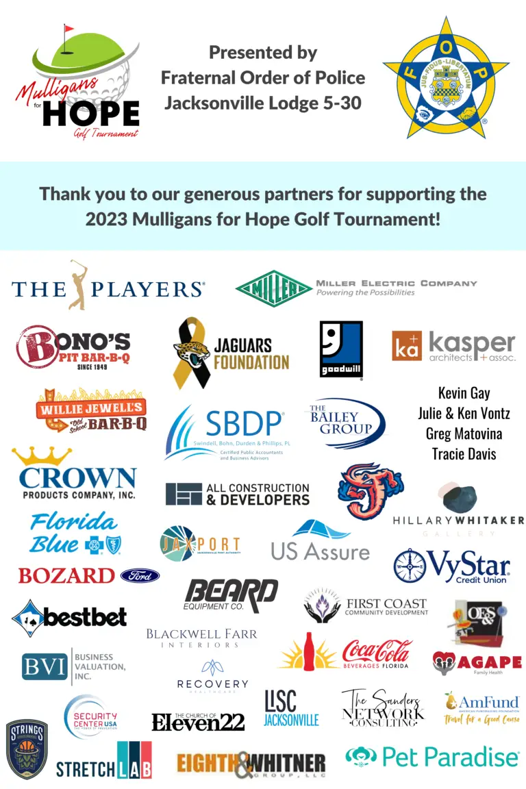 We extend our most sincere thanks to the Fraternal Order of Police (FOP) of Jacksonville for being the Title Sponsor of the tournament. “We are proud to support Operation New Hope and all the work they do to help reconnect people with the workforce, their families and their communities,” said Randy Reaves, Jacksonville FOP President. “We believe in the support they provide and know that their organization has a positive impact on our community.”