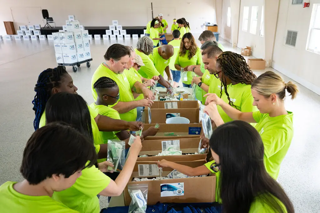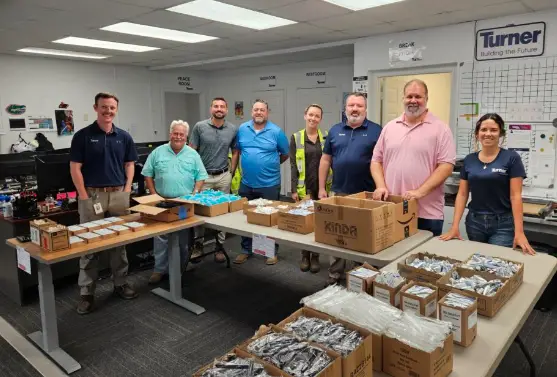 Turner Construction team with hygiene kit supplies.