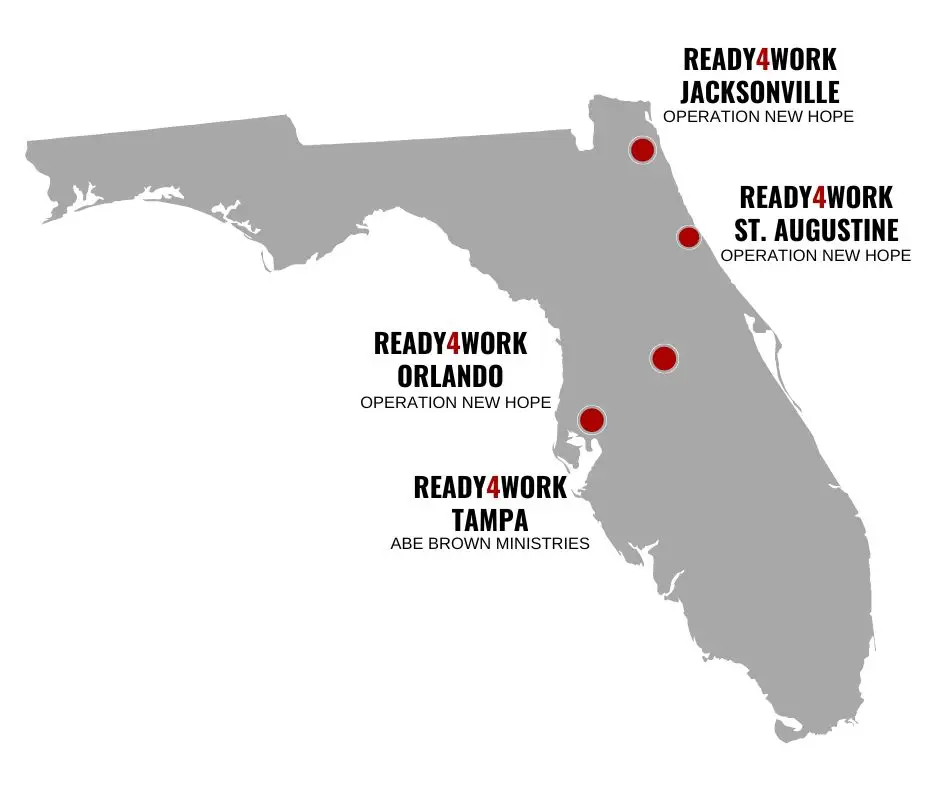 Implementing a comprehensive 4-pronged approach (case management, supportive services, job training, and job placement assistance), Ready4Work is a year-long program focused on long-term participant success. The program creates opportunities for people with a criminal history to become productive, responsible citizens saving taxpayers millions of dollars by avoiding repeated high costs of incarceration, dramatically improving public safety and reuniting families. The Ready4Work program is now delivered in Jacksonville, St. Augustine, Tampa, and Orlando, Florida.
