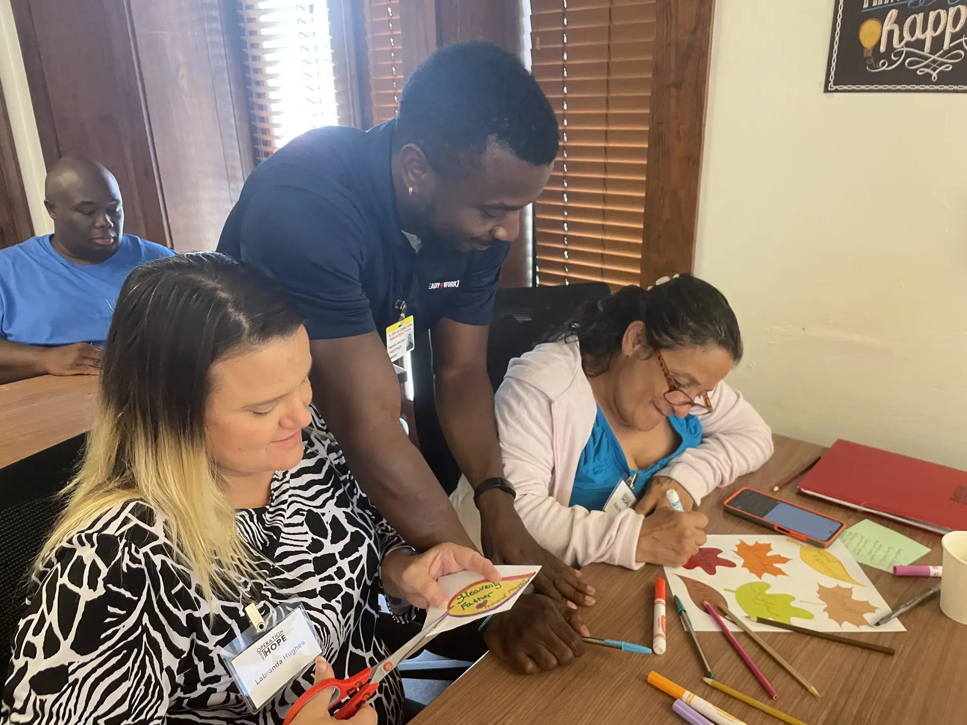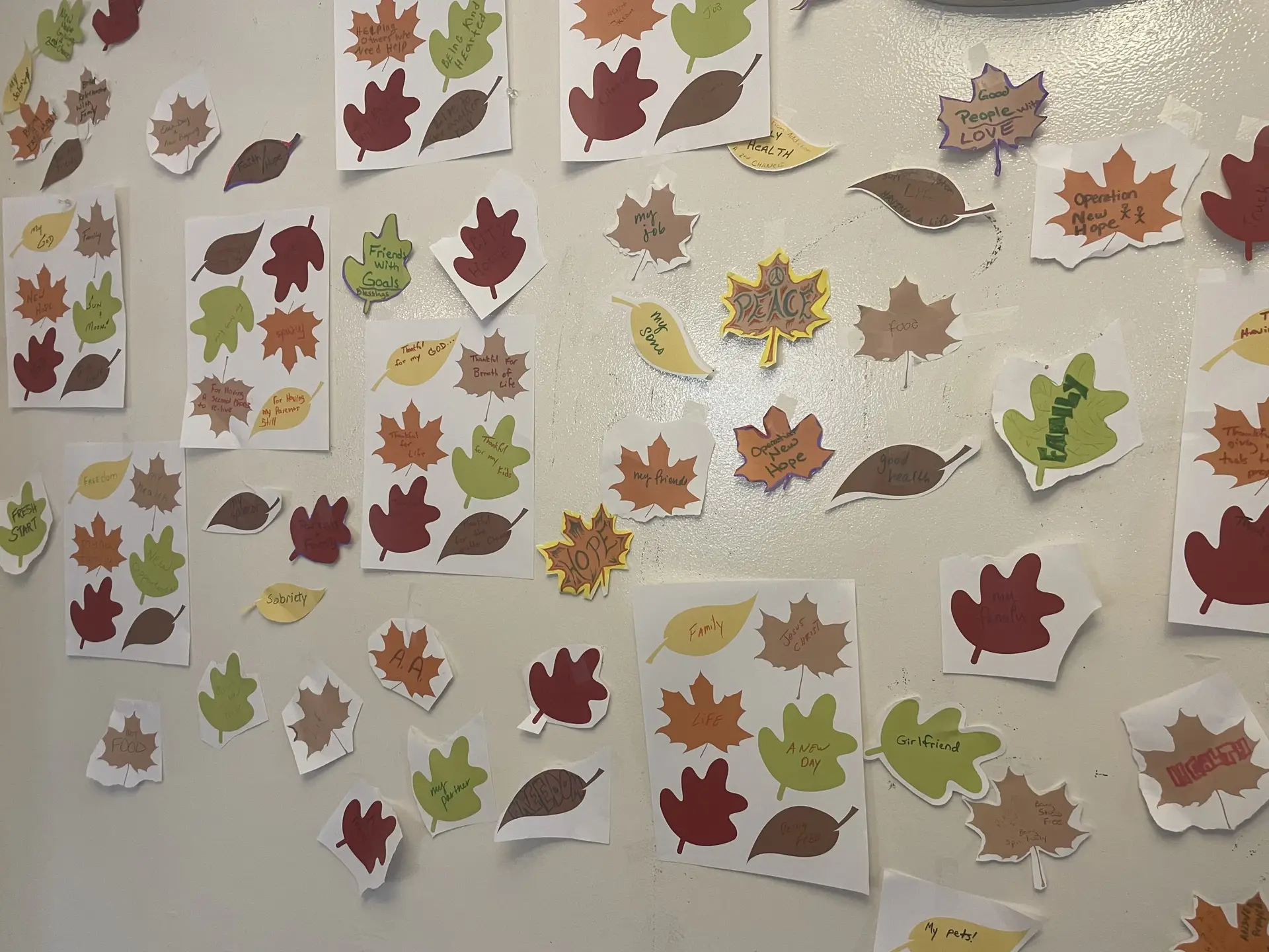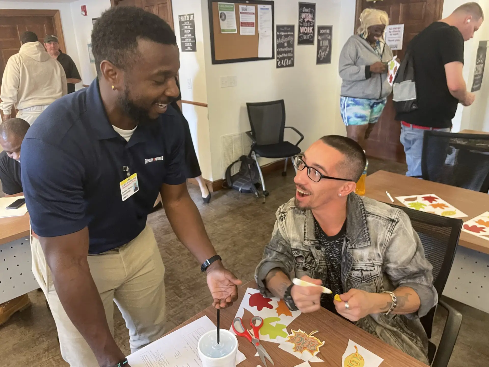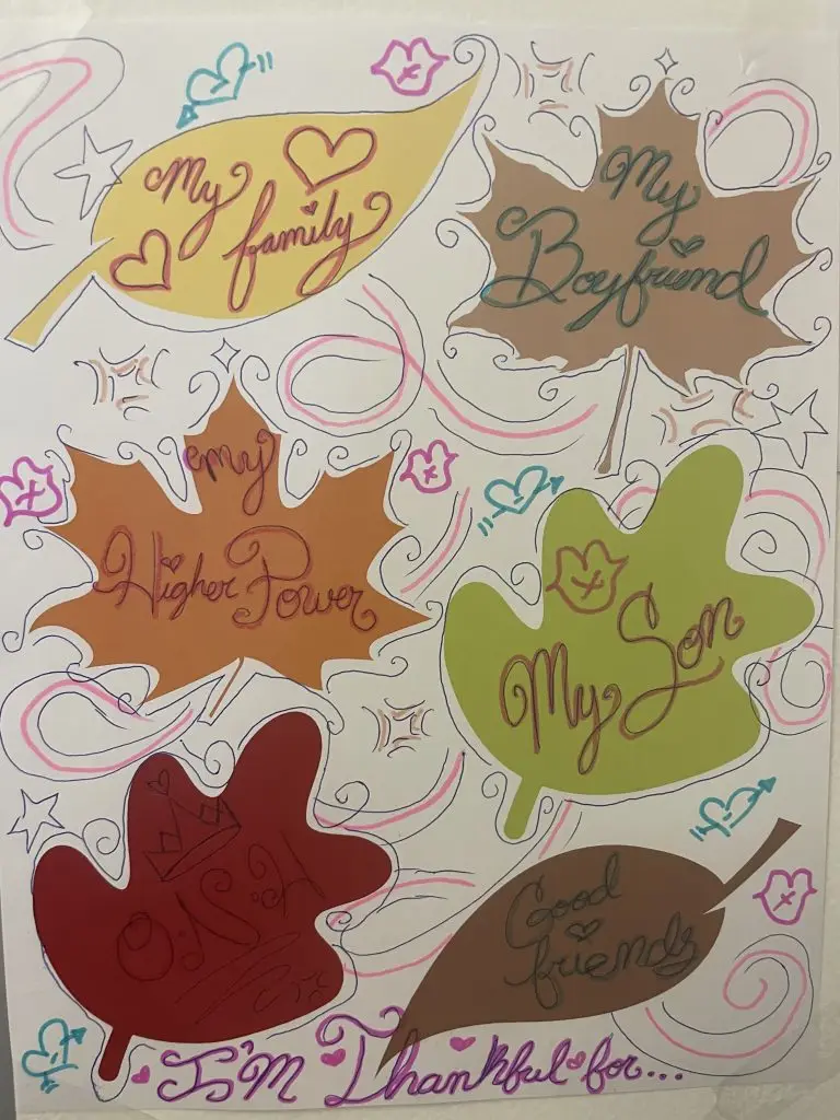 To put theory into practice, Ready4Work then clients took inventory of the many things they are thankful for. The group took those words and placed them on autumn leaves to embody the season of thanks giving. We then hung the colorful leaves of thanks on the Ready4Work classroom walls. The session had everyone smiling and talking about their many blessings, filling the space with warmth and happiness. It was a great way to get into the holiday spirit!