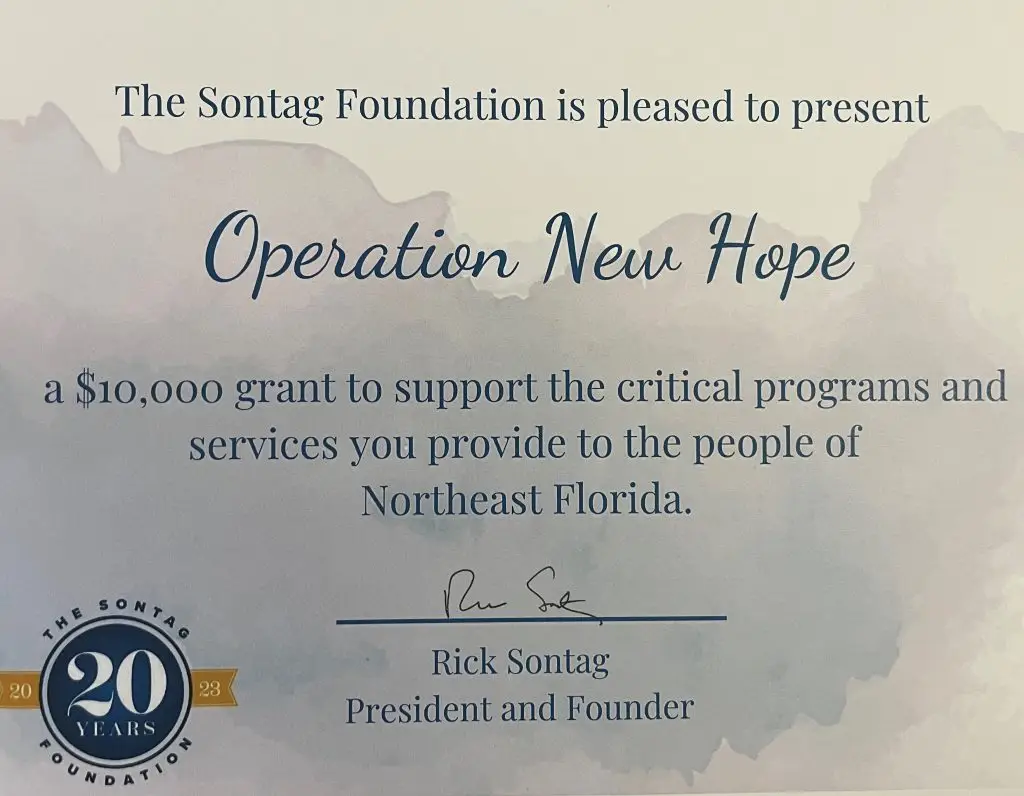 In honor of its 20th anniversary, the Sontag Foundation hosted a celebration last night to highlight the various grant programs that they have supported over the years with over $10 million invested in our community. Operation New Hope was honored to be among the grant recipients. Our team extends our most sincere thanks to the Sontag Foundation for their generous $10,000 grant to support the critical programs and services we provide to the people of Northeast Florida. These funds will go a long way to help our clients reconnect to the workforce, their families, and the community after their release from incarceration. Thank you to the Sontag Foundation for believing in Second Chances!