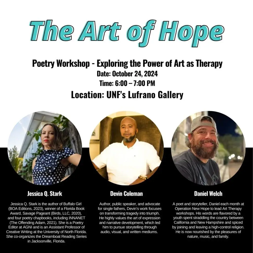 As part of The Art of Hope exhibit, we invite you to a special poetry workshop, where you will experience firsthand how art can be a transformative tool for healing and growth. Join celebrated poets Jessica Q. Stark, Devin D. Coleman, and Daniel Welch as they share their powerful works and lead an interactive writing exercise, modeled after those used with clients in Operation New Hope’s weekly Art Therapy sessions. This workshop will explore how creative expression can help process emotions, overcome personal challenges, and inspire hope.