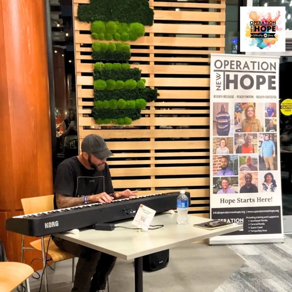 Alongside the visual art displayed in the gallery, attendees enjoyed live music performed by Allen, a former client and Ready4Work graduate. Allen played an original song titled I Know You Know, showcasing his musical talents while sharing his personal journey at Operation New Hope. After experiencing incarceration and struggling with addiction, Allen reflected, “I had never been given a chance or had anyone look at me with hope or care after four years in prison. So to walk out of prison and into a place like Operation New Hope, where they showed me love, compassion, and care, was life-changing. They guided me in the direction I needed to go, and I found my song again.”